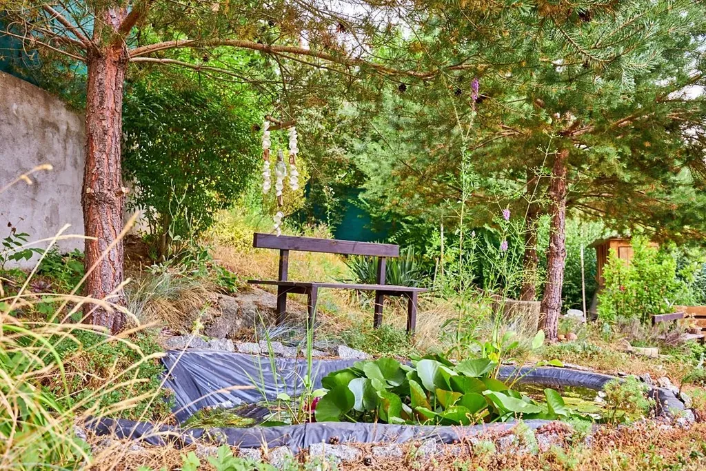 Zadní část pozemku tvoří relaxační zóna. Na malém kopečku mezi vzrostlými stromy stojí dvě kruhové dřevostavby. První slouží jako zázemí pro odpočinek s kuchyňkou, toaletou a venkovní sprchou, ve druhé si posedíte, zagrilujete a úplně vypnete.