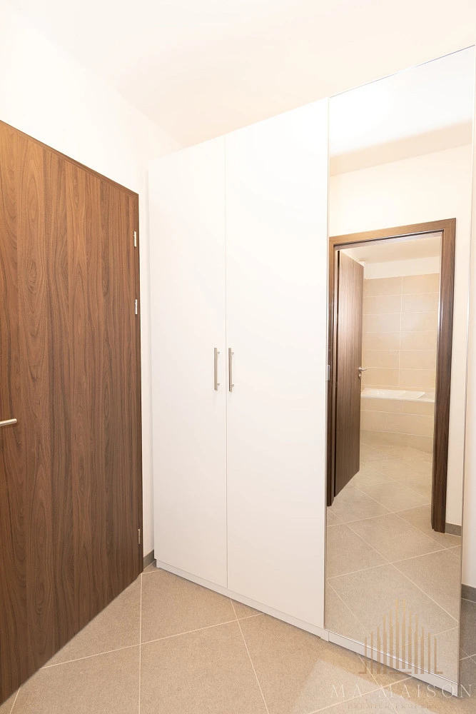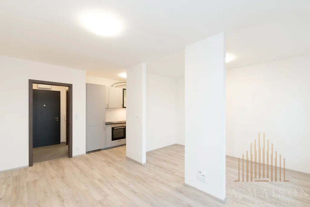 Byt je dispozičně velmi prakticky řešen. V předsíni se nachází šatní skříň. Koupelna je vybavena vanou, umyvadlem se zrcadlem a WC. Hlavní obytný prostor s kuchyňským koutem nabízí moderní kuchyňskou linku se všemi spotřebiči – sporákem, troubou, digestoří, myčkou a lednicí s mrazákem.