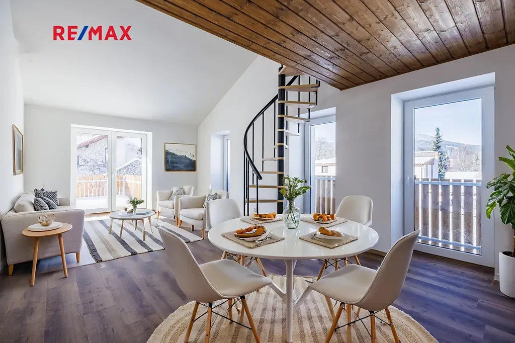 Dispozice tohoto velmi vzdušného a světlého apartmánu 3kk nacházejícího se ve 2NP a jeho podlahová plocha a dobré členění, nabídne až 8 lůžek. Apartmán disponuje malým pokojem se zvýšenou podestou na spaní, velkou ložnicí. Obývací pokoj spojený s jídelním a kuchyňským koutem díky otevřenému prostoru do podkroví působí velice vzdušně a umožnil zbudování mezonetu s plnohodnotným spaním pro další 2-3 osoby. Prostorná chodba pro vestavěné skříně a velká koupelna jsou samozřejmostí. Značným benefitem je prostorná terasa přístupná z obývacího pokoje s krásným výhledem na Černou Horu a západ slunce. V domě je pouze 7 apartmánů, každý má k dispozici vlastní park. místo s možností dobíjení elektromobilu a sklad.prostory.