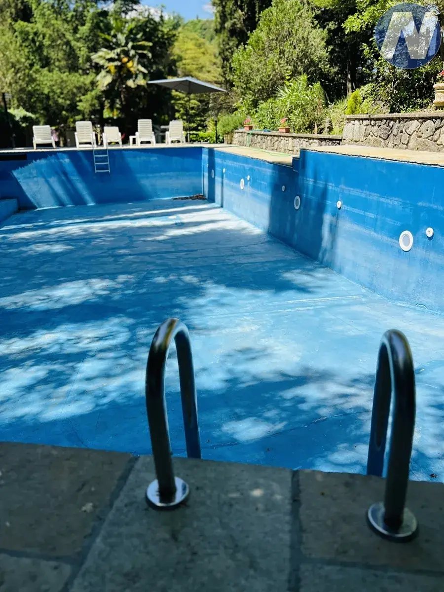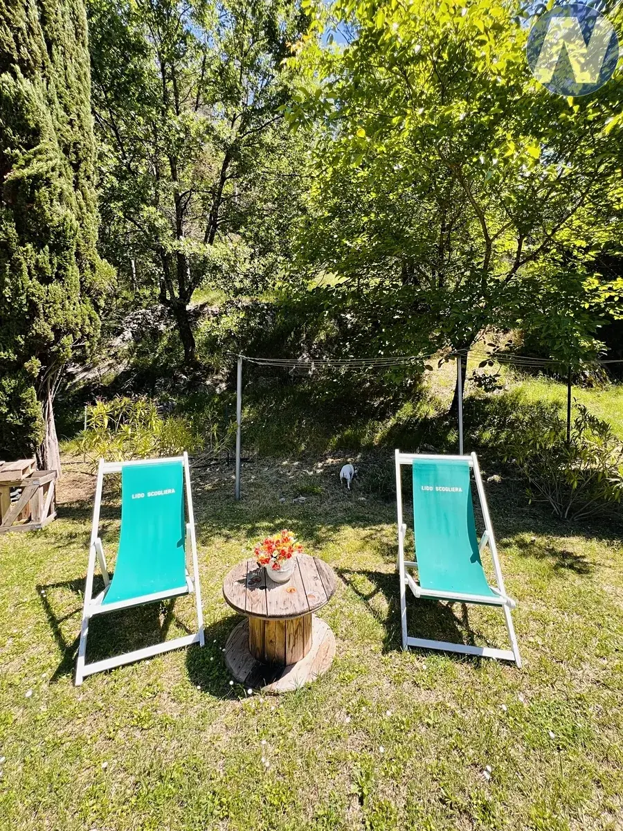 Skvostem zahrady je velký bazén, u kterého vyvěrá vlastní pramen. K domu patří také garáž, zahradní altán, dřevník a tradiční venkovní pec na pizzu. Na pozemku je artézská studna zajišťující dostatek vody pro údržbu zahrady, cypřišového háje a ovocného sadu.