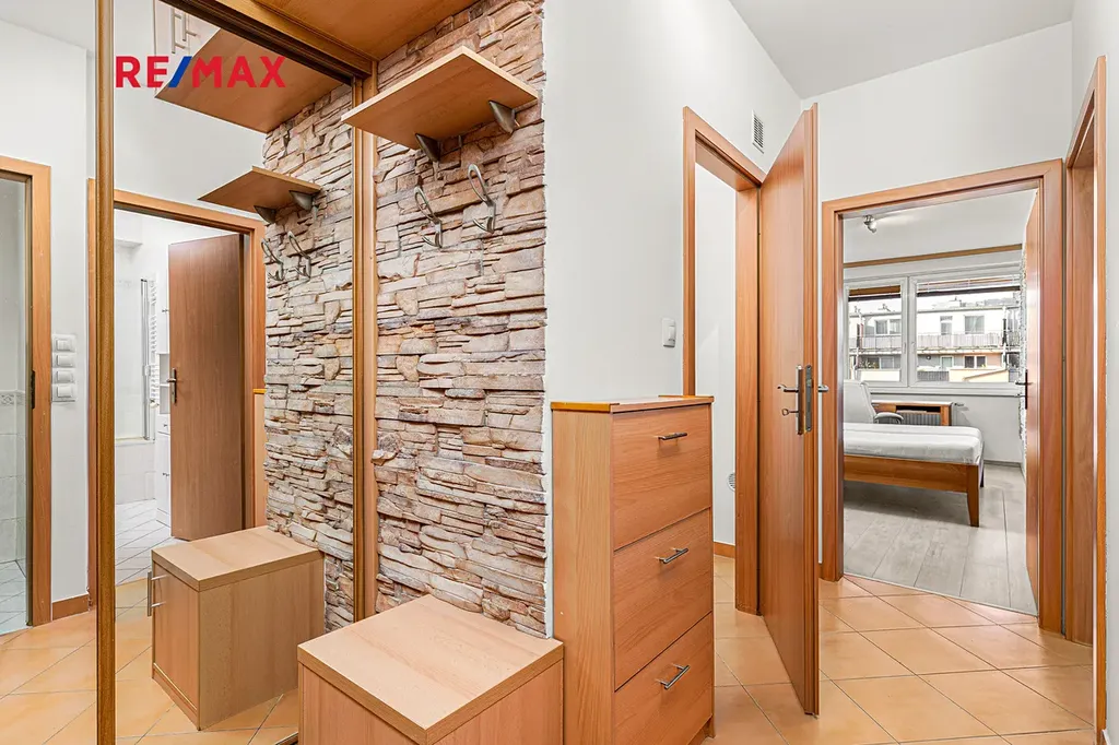 Byt se nachází v šestém patře zatepleného domu s výtahem a výhled z oken i balkónu je orientován do klidného vnitrobloku. Nabízí se kompletně vybavený nábytkem, který je vidět na fotografiích (rozkládací sedací souprava, jídelní stůl s židlemi, postel s matracemi, šatní skříň, psací stůl). Součástí kuchyňské linky je varná deska, elektrická trouba, pračka. K vybavení náleží lednice kombinovaná s mrazákem. Myčka zde není. V koupelně se nachází vana a umyvadlo, toaleta je separátně oddělená. Kromě obývacích místností je v bytě je také poměrně prostorná komora. Součástí pronájmu je dále sklep o rozloze 6,5m², který se nachází hned před parkovacím stáním.