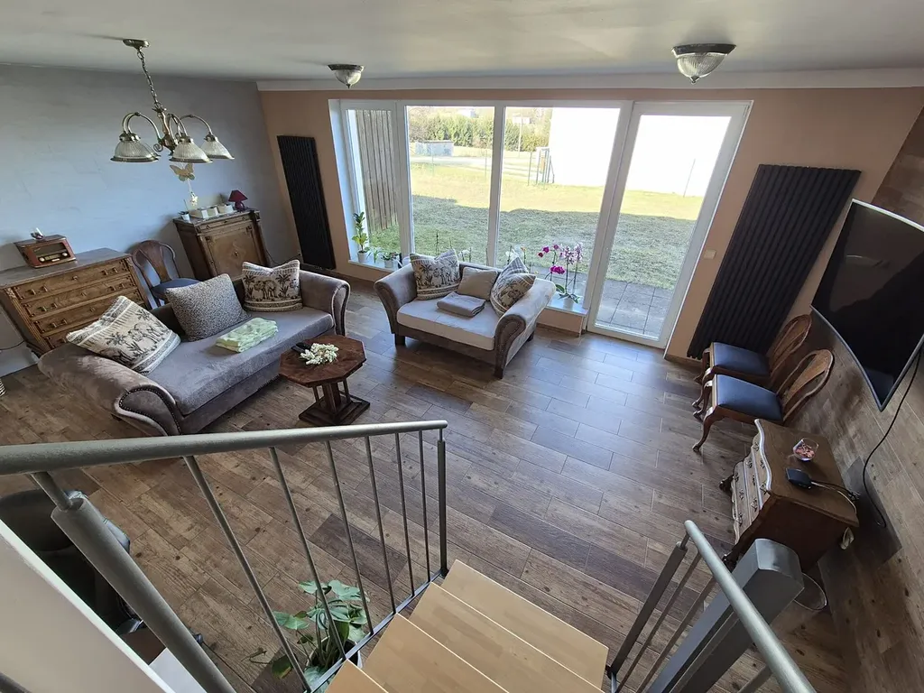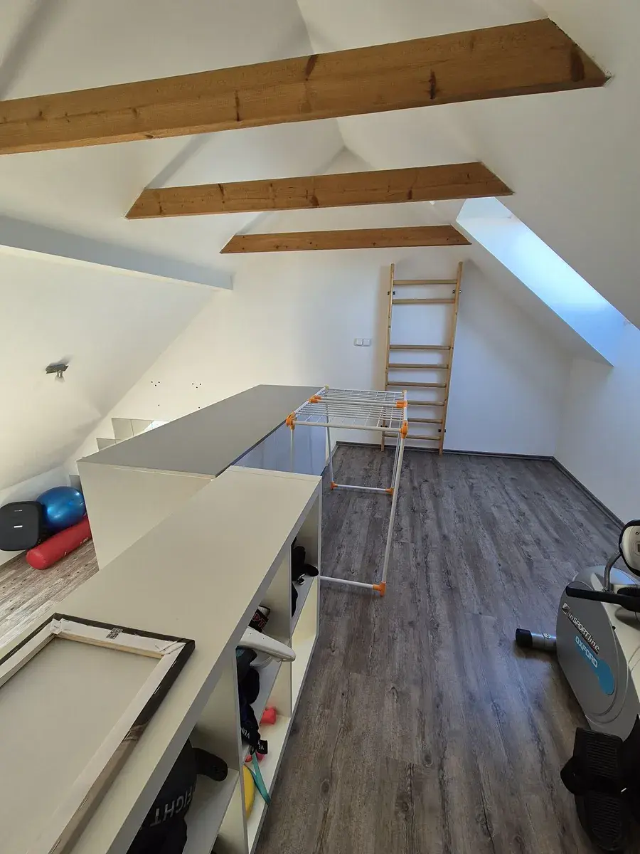 Dispozice domu - v přízemí se nachází obývací pokoj (5,00x6,60m) se vstupem na zahradu, v 1NP je umístěn hlavní vchod do domu, chodba s vestavěnými skříněmi, kuchyň (3,15x5,00m) vybavená kuchyňskou linkou (lednicí s mrazákem, digestoří, myčkou nádobí, horkovzdušnou troubou, indukční deskou, granitovým dřezem), samostatné wc (umyvadlo, úpravna vody) a komora (nyní je zde umístěna aut. pračka a úložné regály). Ve 2NP je koupelna s umyvadlem a sprchovým koutem, další samostatné wc (vestavěné skříně, je zde umístěn plynový kotel a ohřev vody), pokoj s francouzským oknem (4,10x4,60m). Ve 3NP se nachází ložnice (4,30x2,80m) s velkým úložným prostorem, vestavěnou skříní a obytným patrem (1,20x2,00m), další pokoj s vestavěnou skříní (4,20x3,02m) s úložnými prostorami a obytným patrem (4,20x1,20m). Na podlaze v celém domě jsou kvalitní dlažby a vinyl, v koupelně a na wc keramické obklady a dlažba, vytápění plynovým kotlem zn. Baxi, v domě jsou topná tělesa (panely).