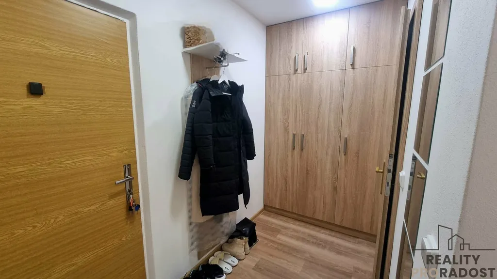 Byt je vybaven kuchyňskou linkou s vestavěnými spotřebiči (myčka, el.trouba, varná deska, digestoř, lednice s mrazákem. V předsíni se nachází vestavěná šatní skříň, věšák a botník, které zajišťují dostatek úložného prostoru.
