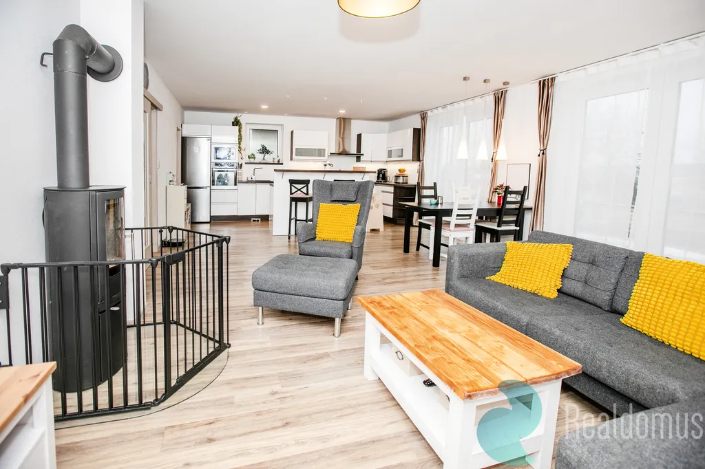 Hned po vstupu do zádveří odložíte kabáty a boty a projdete do chodby s praktickým samostatným WC. Srdcem domu je světlý obývací pokoj s moderní, plně vybavenou kuchyní, kde se bude odehrávat většina rodinných chvil. V zimě doplní atmosféru krbová kamna, v létě si vychutnáte kávu nebo grilování na terase (35m²) s výhledem do rozlehlé zahrady. u terasy s markýzou na ovládání se nachází skalka s jezírkem.