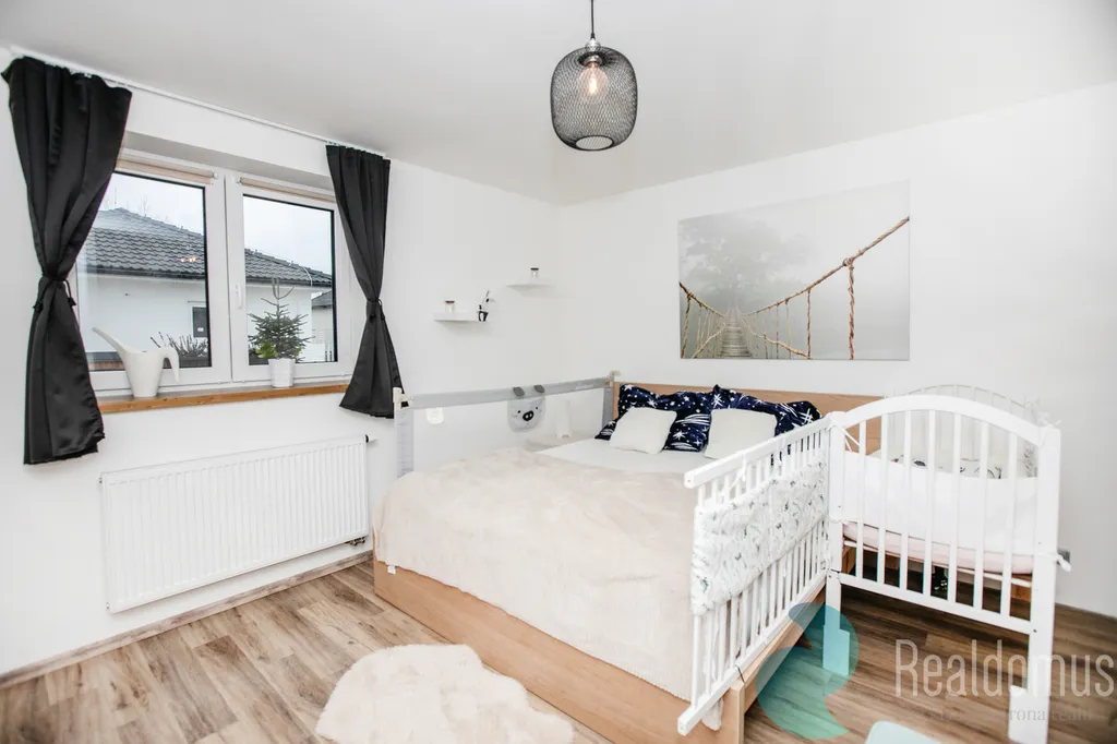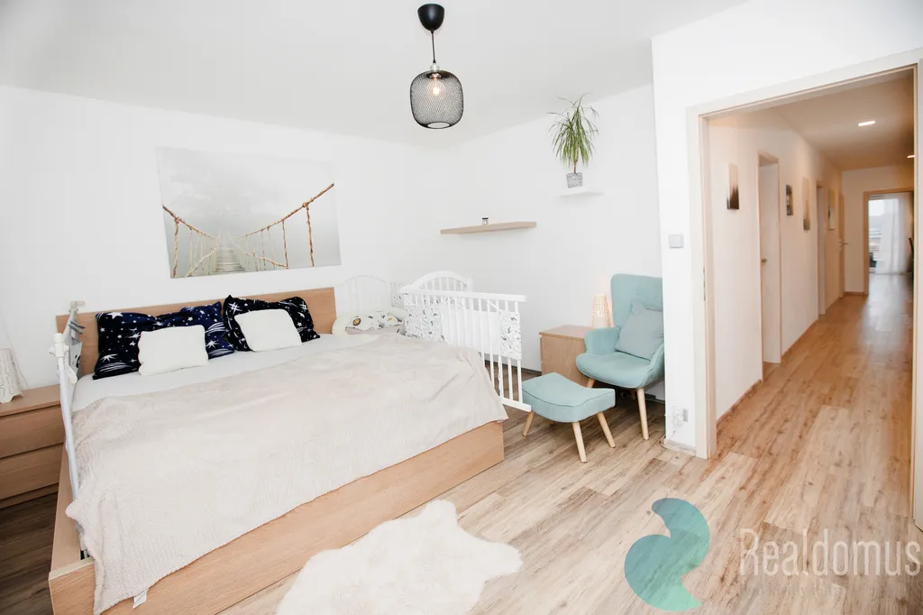Z centrální chodby se dostanete do pracovny (11,5 m²) – ideální pro home office nebo pokoj pro hosty. Dále do prostorné koupelny (9 m²) s vanou, sprchovým koutem a WC, Klidný spánek budet mít v ložnici (16 m²).