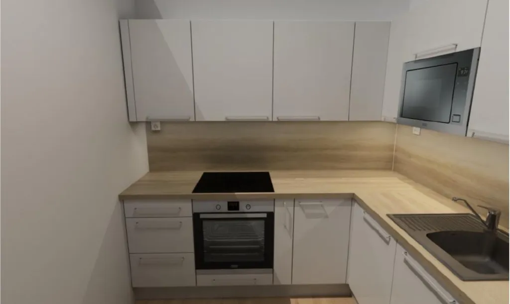Byt se nabízí částečně vybavený. Kuchyně disponuje lednicí, myčkou, elektrickou troubou, varnou deskou, vestavěnou mikrovlnnou troubou a digestoří. Obývací část je nezařízena. V koupelně je vana a umyvadlo. Toaleta je umístěna samostatně.
