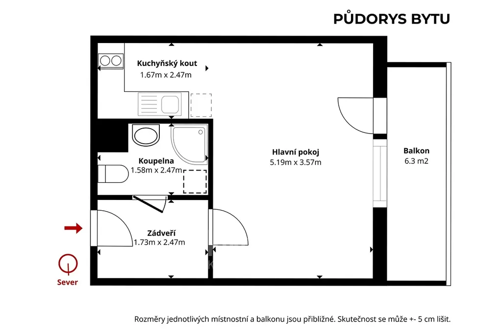 K dlouhodobému pronájmu nabízíme byt o dispozici 1+kk a podlahové ploše 31.6 m2 + balkon 6.3 m2: