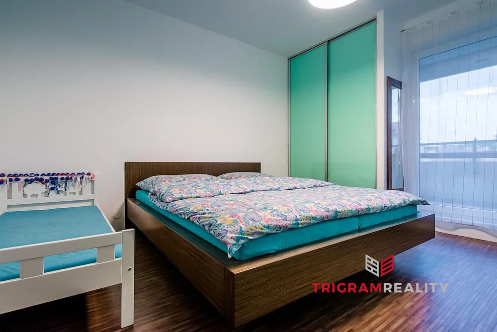 Obývací pokoj s kuchyňským koutem a ložnice jsou prakticky odděleny, což zaručuje dostatek soukromí i v kompaktním prostoru. Z ložnice je vstup na slunný balkon orientovaný na jih (5,5 m²) s klidným výhledem do okolí, částečně lemovaným vzrostlými stromy – ideální místo pro ranní kávu či večerní relax.