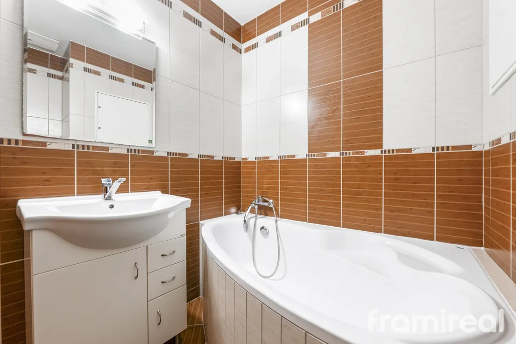 V chodbě se nachází komoda a věšáková stěna se zrcadlem, které poskytují další úložný prostor a komfort při vstupu do bytu. Koupelna je vybavena vanou, umyvadlem, toaletou a pračkou.