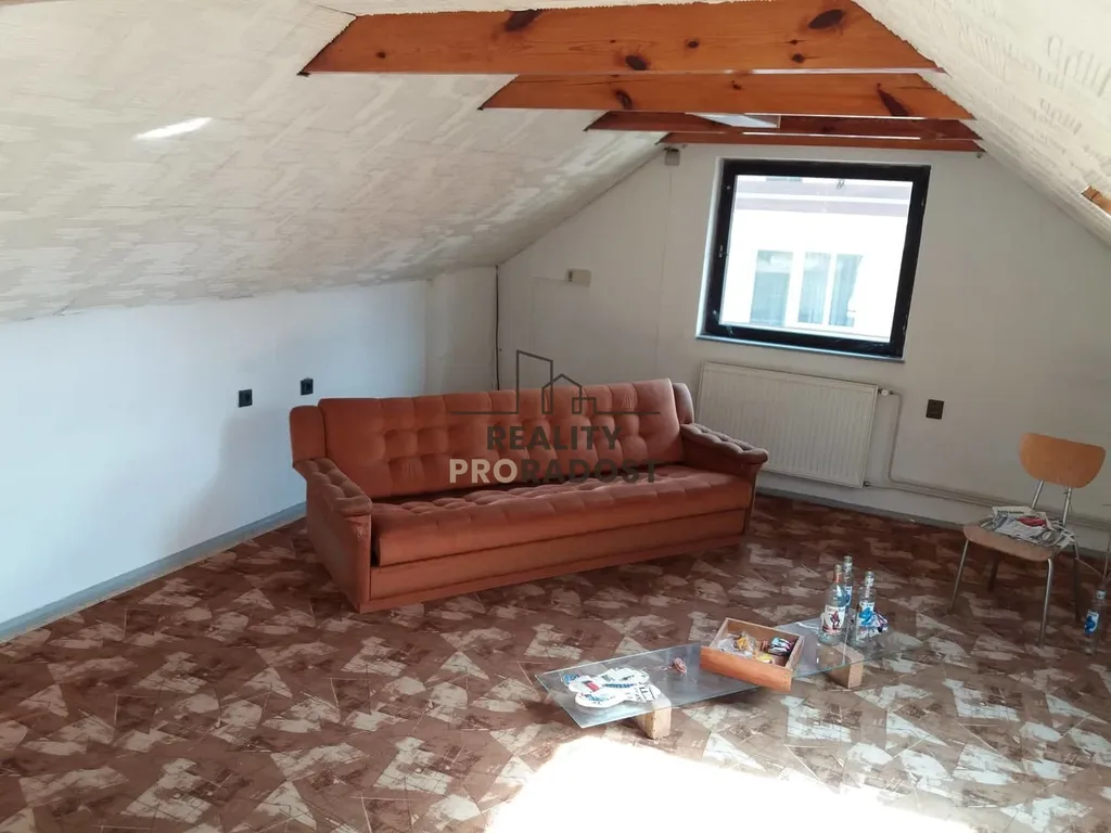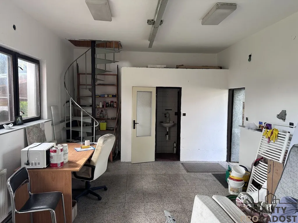 která disponuje sociálním zázemím WC + sprcha, kanceláří či ateliérem a garáž - sklad.