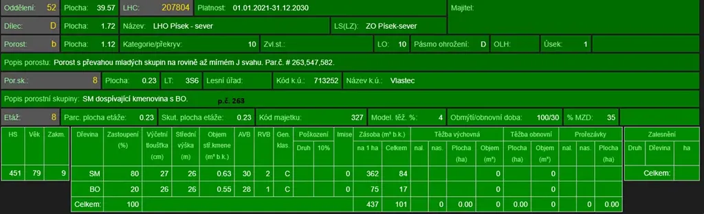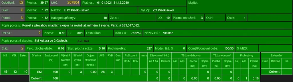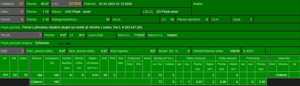 - p.č. 263 vedená jako lesní pozemek o celkové výměře 11 220 m2, z toho vlastníme podíl 1/8 tedy 1 403 m2 (stáří lesa 94, 84 a 39 let - zastoupení dřevin smrk a borovice, stáří lesa 29 a 17 let - zastoupení dřevin smrk),