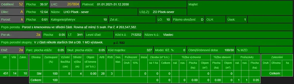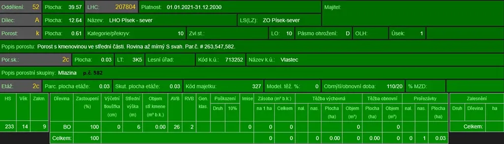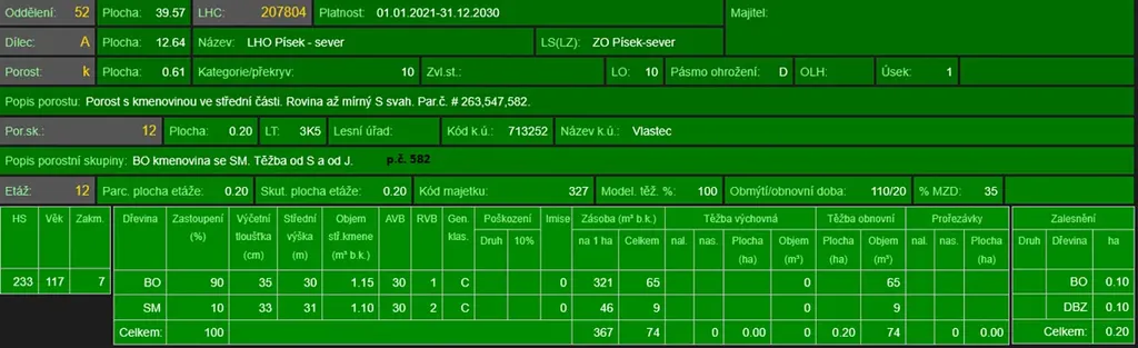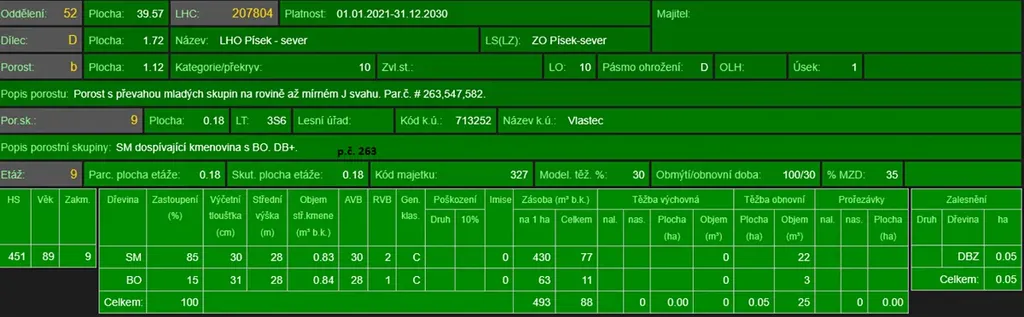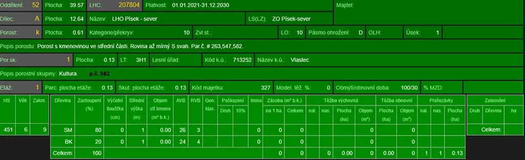 - p.č. 582 vedená jako lesní pozemek o celkové výměře 6 122 m2, z toho vlastníme podíl 1/8 tedy 765 m2 (stáří lesa let 122 - zastoupení dřevin borovice, smrk, stáří lesa 41 let - zastoupení dřevin jedle, stáří lesa 23 let - zastoupení dřevin smrk, stáří lesa 19 let - zastoupení dřevin borovice, smrk, stáří lesa 11 let - zastoupení dřevin smrk, buk).