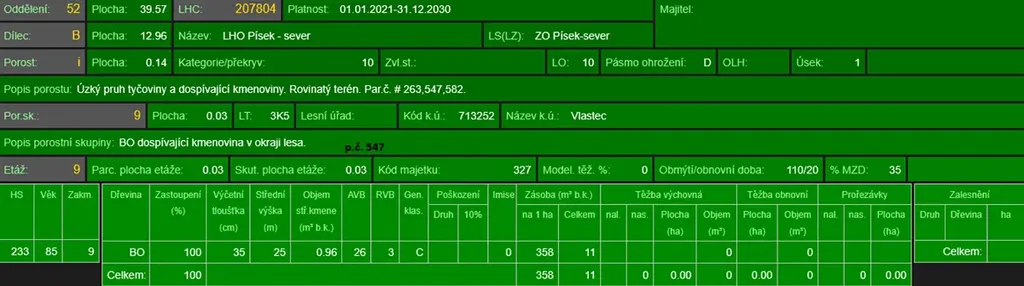 - p.č. 547 vedená jako lesní pozemek o celkové výměře 1 365 m2, z toho vlastníme podíl 1/8 tedy 171 m2 (stáří lesa 90 let - zastoupení dřevin borovice, stáří lesa 38 let - zastoupení dřevin douglaska),