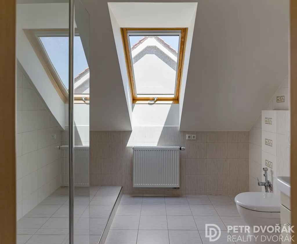 V patře je umístěna prostorná ložnice s výhledem do zahrady, koupelna a úložné prostory. Ložnice je orientována na severozápad, což zajišťuje klid a soukromí.