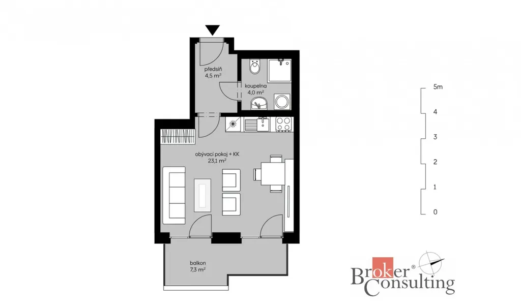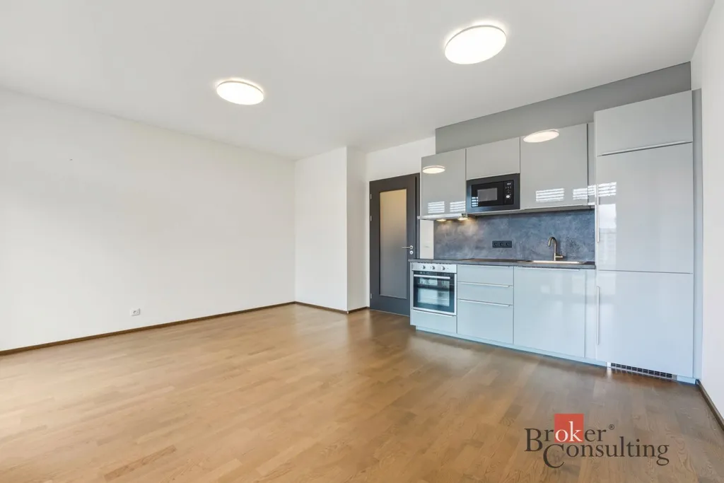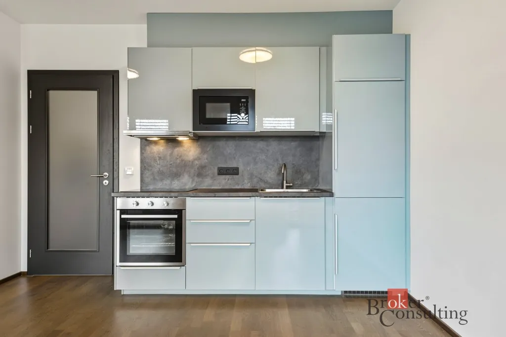 Dispozice bytu zahrnuje předsíň, koupelnu a obývací pokoj s kuchyňským koutem a přímým vstupem na prostorný balkón (7,3 m²), který nabízí příjemné místo k odpočinku. Kuchyňský kout je vybaven moderní kuchyňskou linkou včetně lednice s mrazákem, horkovzdušné trouby, indukční varné desky, mikrovlnné trouby a digestoře. Komfort bydlení zvyšují také elektricky ovládané venkovní žaluzie, které zajišťují soukromí, regulaci světla i tepelný komfort během celého roku.