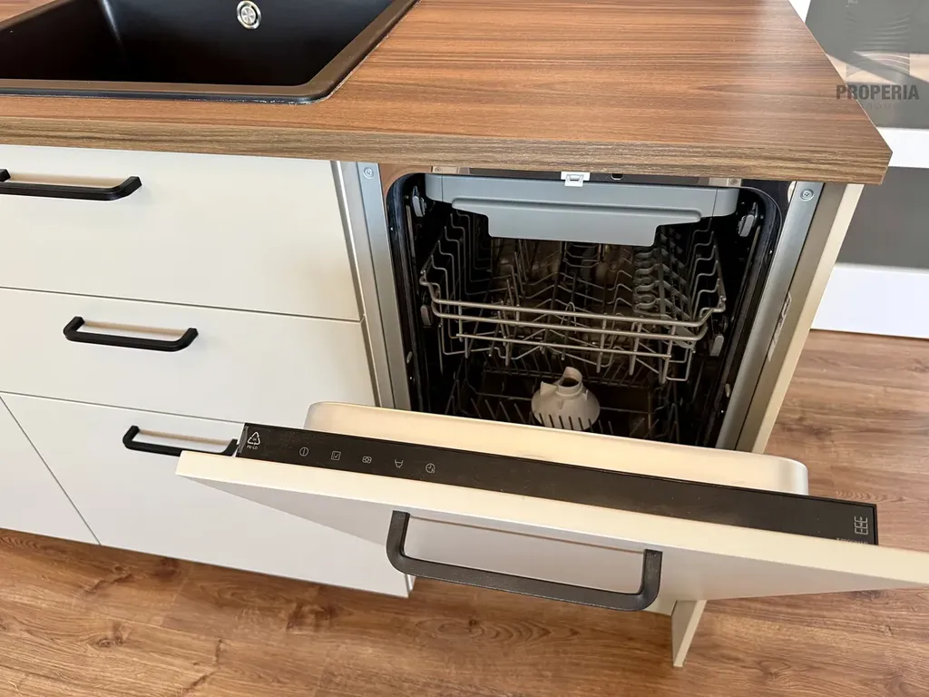 Byt není vybaven nábytkem kromě komfortní postele a stylové kuchyňské linky s vestavěnými spotřebiči - indukční varná deska, myčka nádobí, horkovzdušná trouba - viz. fotodokumentace. Jeho komfort dotváří koupelna s oknem, sprchovým koutem, WC a prostorem pro pračku.
