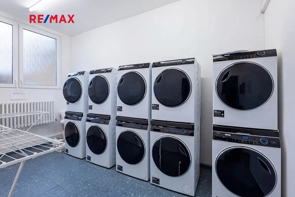 V domě je fitness centrum, prádelna se sušičkami, klubovna, skladiště na kola a kočárky...