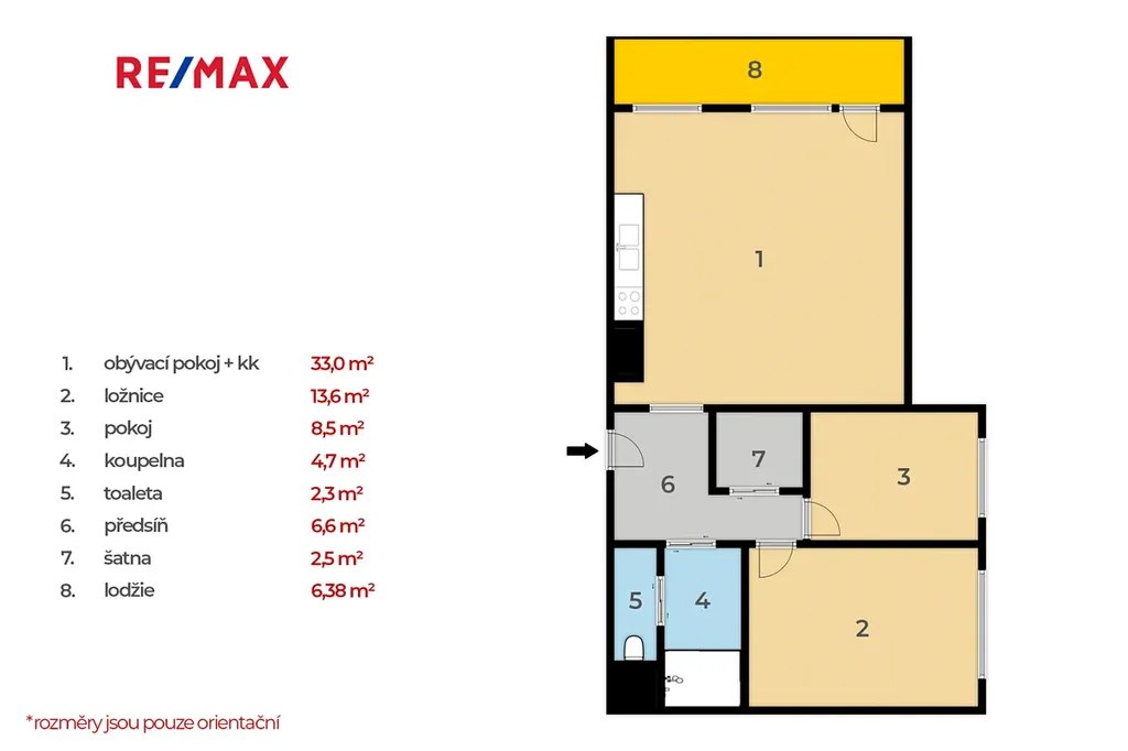 Orientace dle světových stran: Obývací pokoj je orientován na západ, ložnice a pokoj na sever.