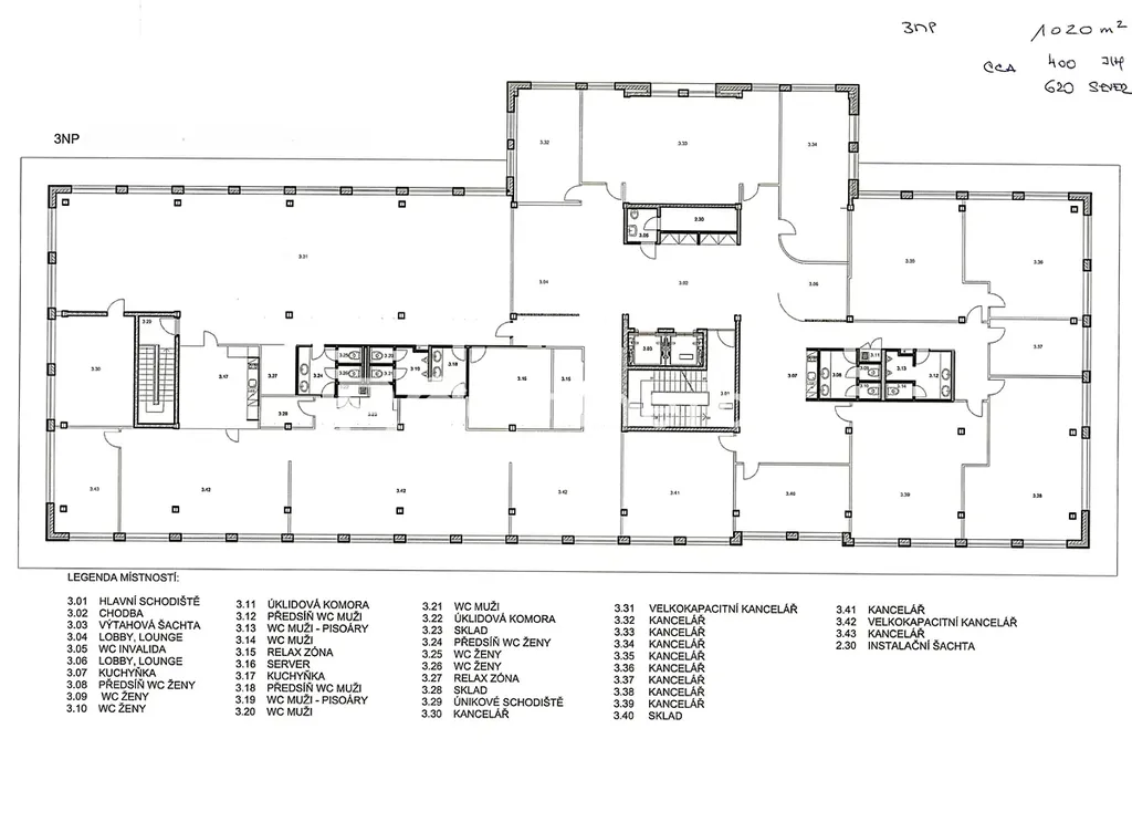 Celé podlaží má výměru 1020m2 a je kombinací jednotlivých kanceláří, jednacích místností a open space prostoru. Kuchyňky i sociální zázemí jsou umístěny ve dvou místech na podlaží.
