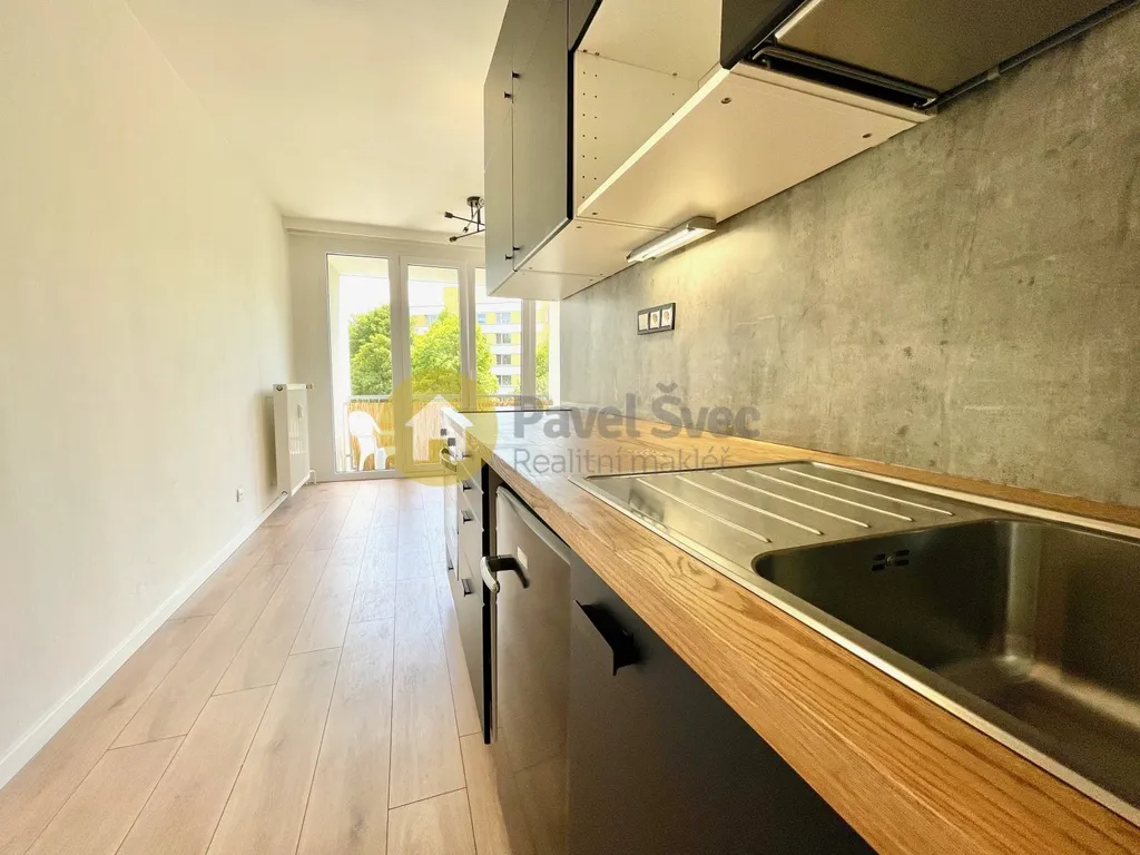 Rekonstruovaný byt je vybavený kuchyňskou linkou s dvouvařičem se sklokeramickou deskou, elektrickou vestavěnou troubou, chladničkou s mrazicí policí, odkapávací skříňkou atd.