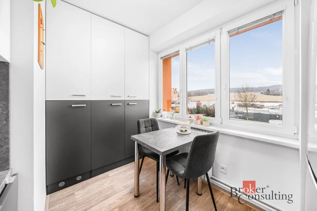 Byt se nachází v 1. patře zatepleného cihlového domu, je orientovaný na západ a má praktickou dispozici s neprůchozími místnostmi. Pronajímá se kompletně vybavený moderním nábytkem a spotřebiči (pračka, myčka, lednice s mrazákem, trouba, varná deska, mikrovlnná trouba, TV).