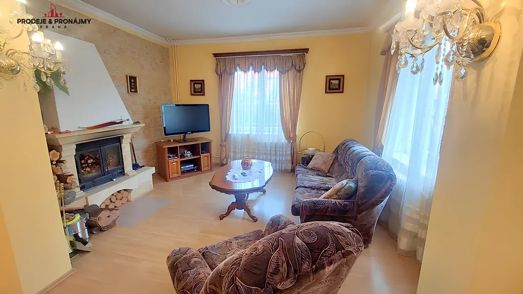 Přízemí disponuje: Pracovnou, koupelnou s vanou, samostatné WC, ložnici a prostornou obývací místnosti s funkčním krbem a vstupem do komory.