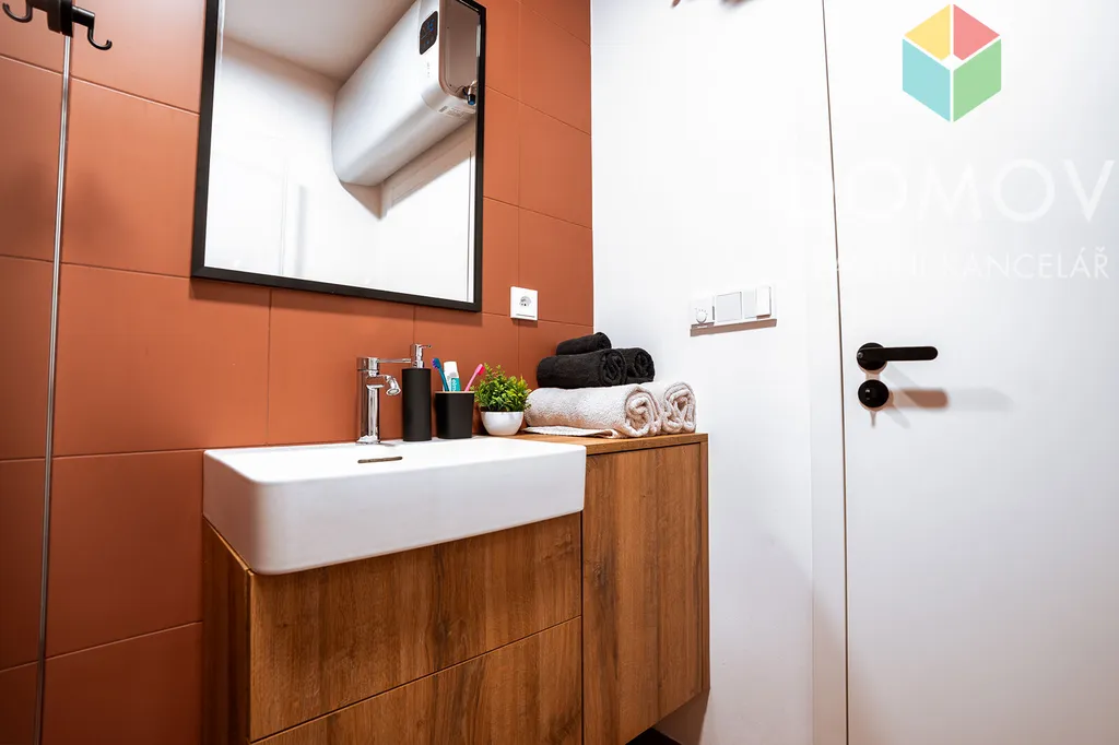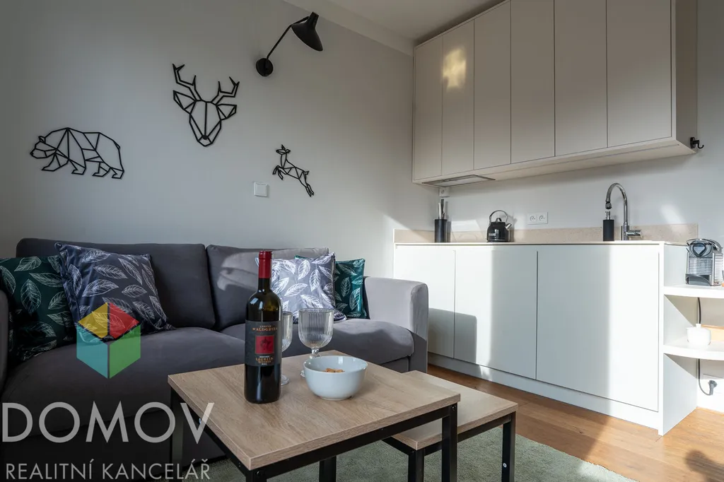 Dispoziční členění: vstupní chodba ve které jsou umístěné vestavěné skříně, kuchyňský kout zařízen moderní kuchyňskou linkou se spotřebiči na níž volně navazuje obývací pokoj, vybavená ložnice s vestavěnými skříněmi , koupelna zařízena sprchovým koutem, WC samostatně.