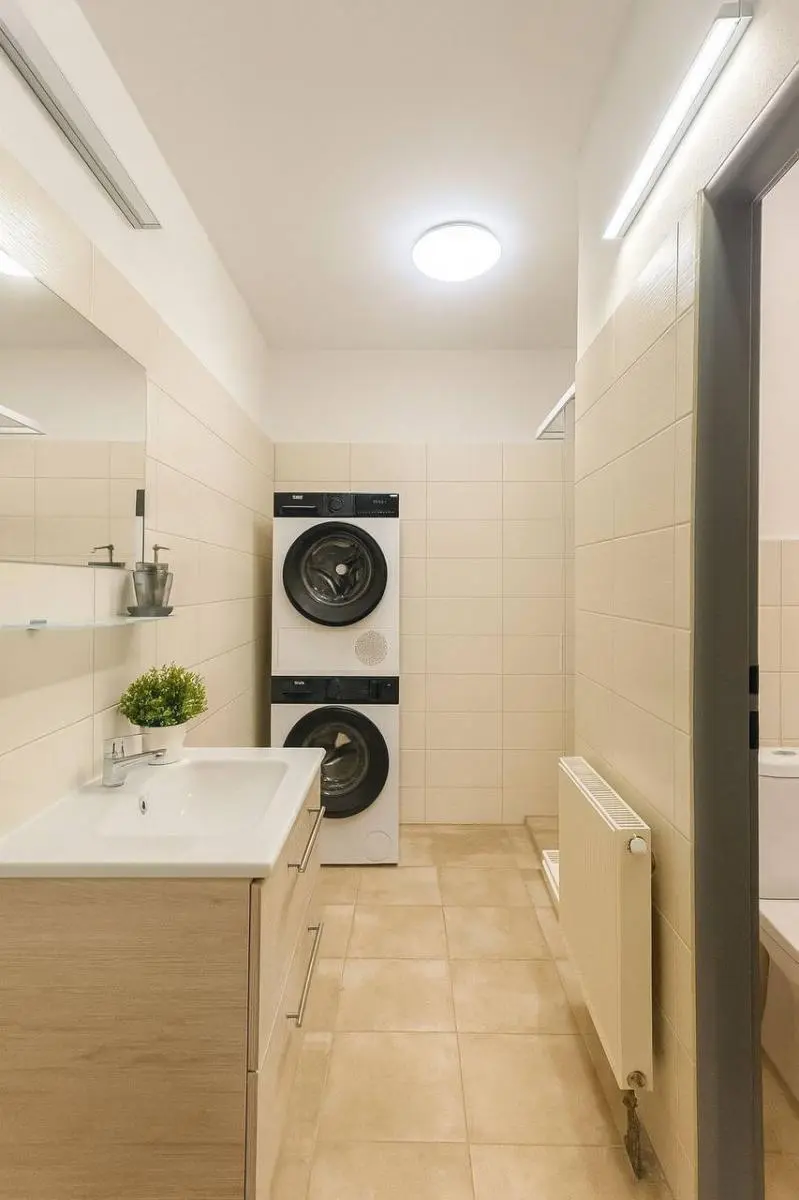 Koupelna je vybavena sprchovým koutem, pračkou a sušičkou, toaleta je samostatná.