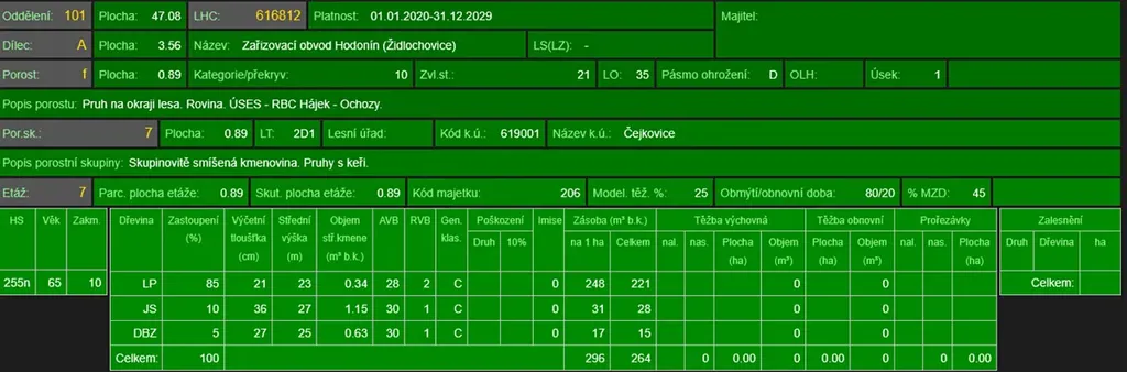 - p.č. 993/1 vedená jako lesní pozemek o celkové výměře 8 895 m2 (stáří lesa 71 let - zastoupení dřevin lípa, jasan, dub).
