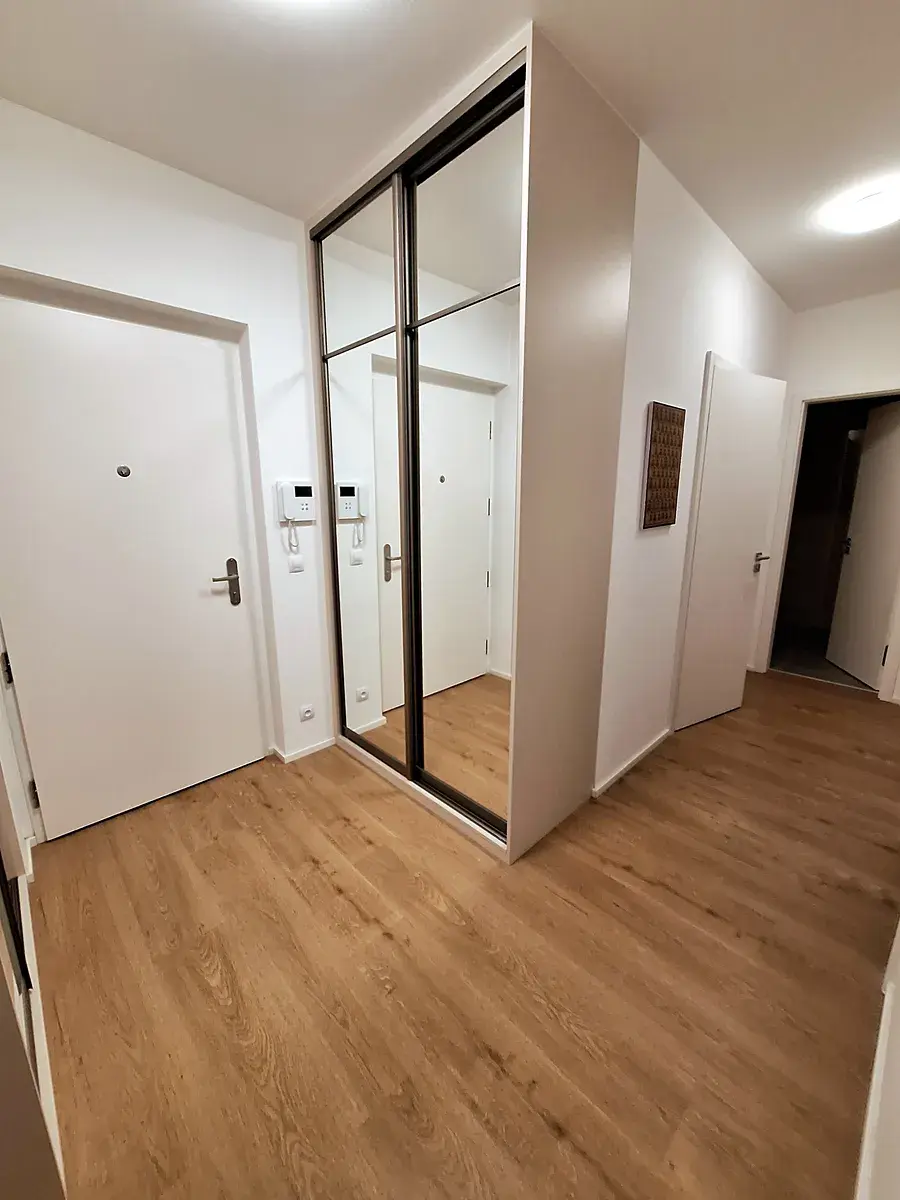 Byt ve 2. patře v bloku E novostavby Vás uvítá vstupní halou s vestavěnými skříněmi. V pravo je pak srdce celého bytu, prostorný obývací pokoj s kuchyňským koutem, jídelní částí a vstupem na terasu. Zaujme velkoformátové prosklení oken. Dřevěná podlaha a prostorná kuchyňská linka s vestavěnými spotřebiči.