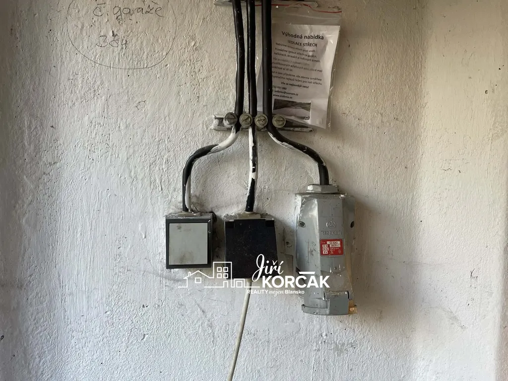 Garáž je napojena na elektrickou energii s vlastním měřením a k dispozici je také zásuvka 380 V / 32 A,