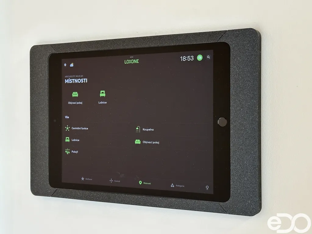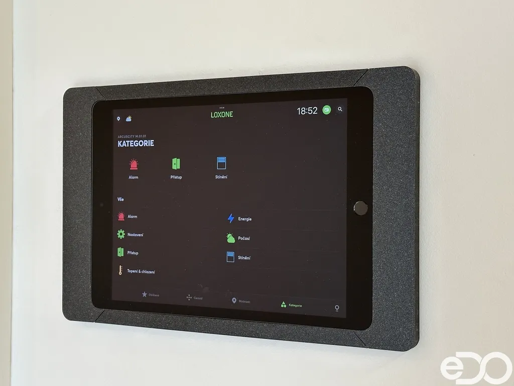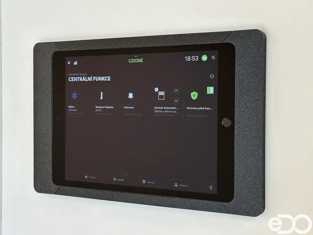 Byt dále disponuje moderním smart home systémem Loxone, který umožňuje mimo jiné inteligentní ovládání venkovních žaluzií, regulaci podlahového vytápění a chlazení v každé místnosti či monitorování spotřeby vody a energie.