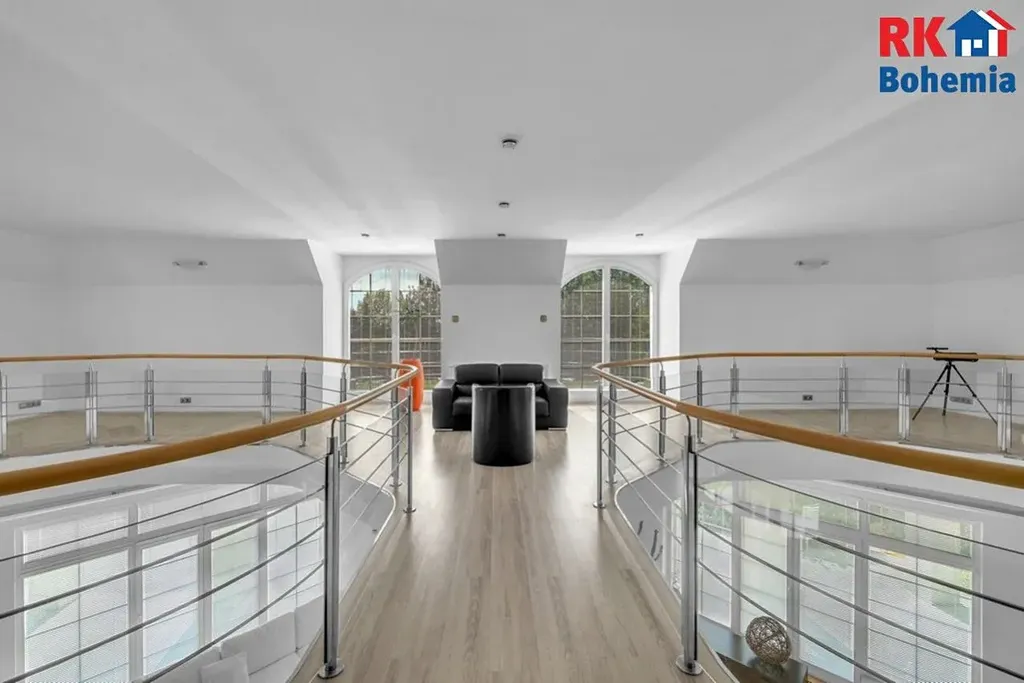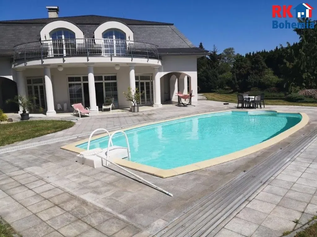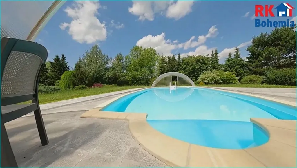 Bonusem je velmi citlivě upravená zahrada ze zavlažováním, se vzrostlými stromy a s travnatou plochou na heliport či tenisové kurty. Pozemek s vyhřívaným krytým bazénem a jezírkem velmi dobře doplňuje výjimečnost samotné stavby. Může sloužit pro rodinnou relaxaci a odpočinek a rovněž dokáže nabídnout potenciál v případě komerčního využití.