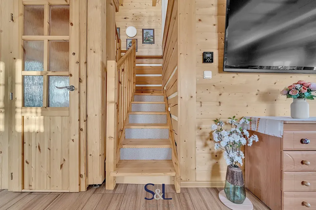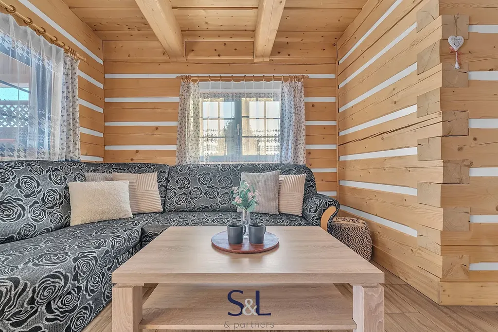 Interiér je řešen především v přírodních materiálech – stěny i půda jsou obloženy silnými srubovými palubkami a stropy jsou celodřevěné z překládaných prken, což zvyšuje tepelný komfort, akustiku i celkovou estetiku domu.