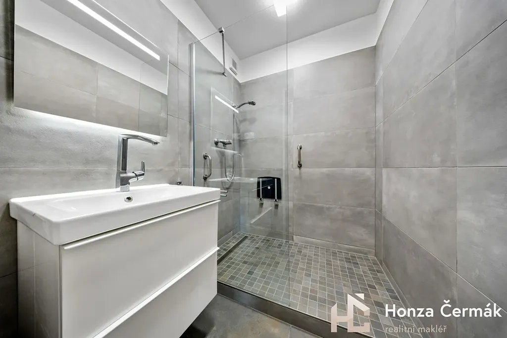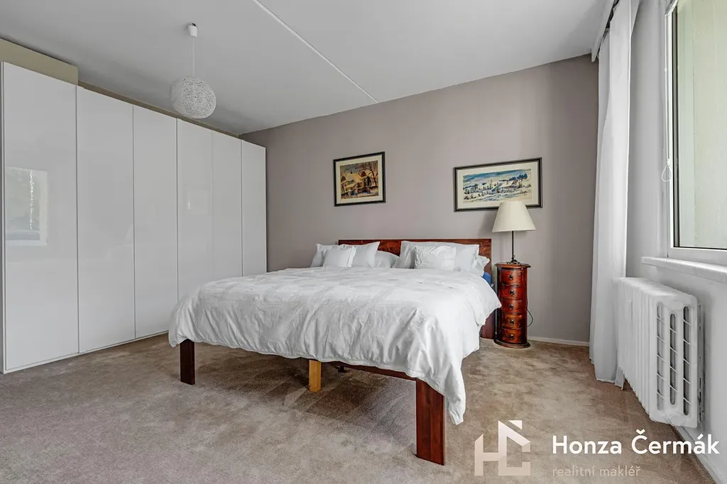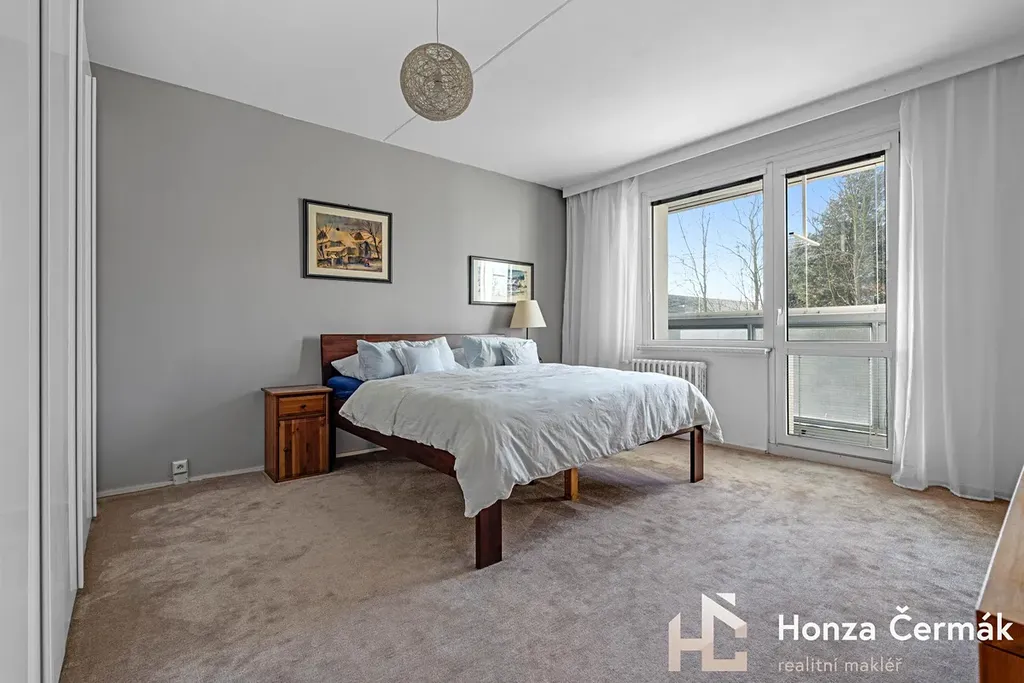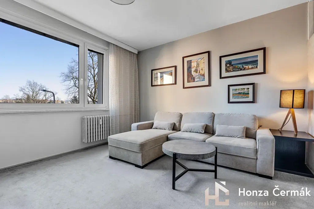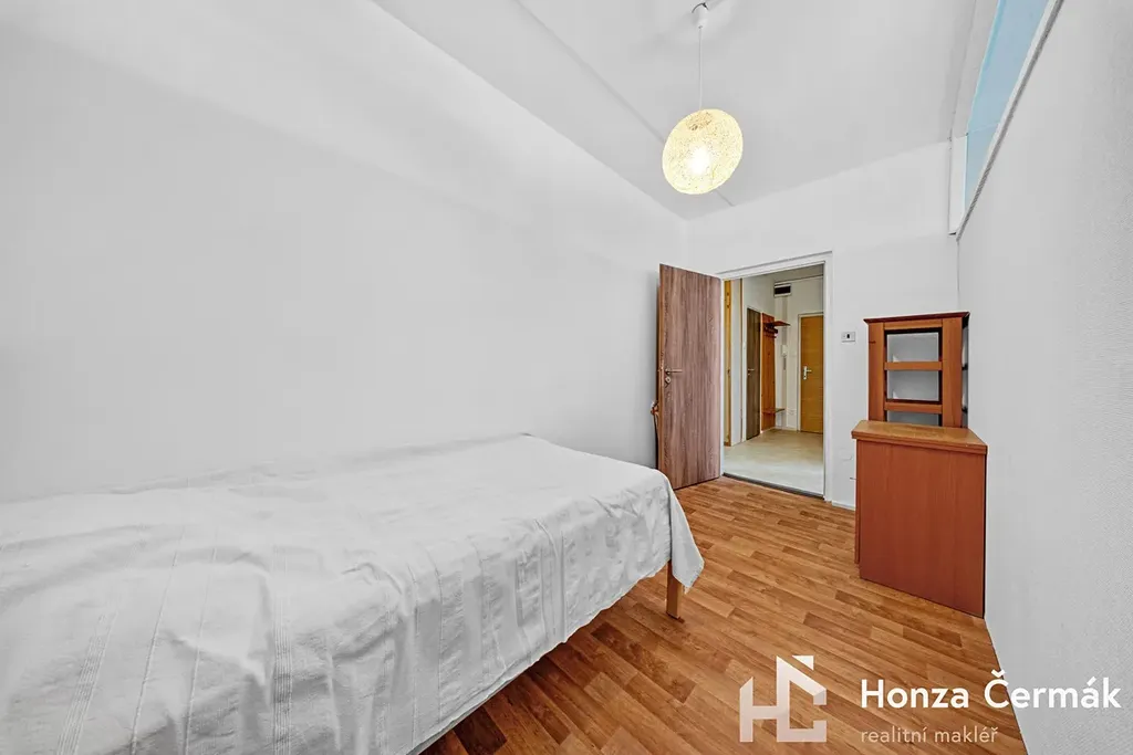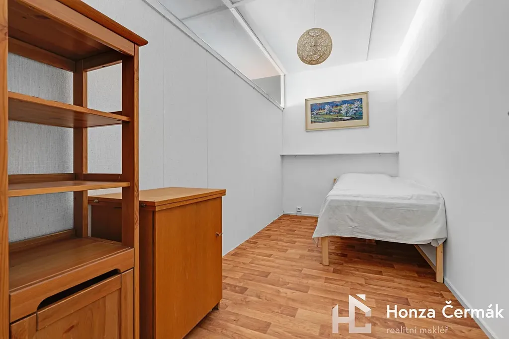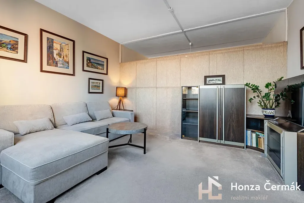 Obývací pokoj momentálně rozděluje lehká příčka, díky které vznikl samostatný spací kout. Pokud byste ale preferovali jeden velký otevřený prostor, tuto konstrukci lze velmi snadno odstranit bez nutnosti složitých stavebních úprav. Ložnice je orientovaná směrem k zeleni a náleží k ní prostorná zasklená lodžie. Byt se prodává částečně zařízený, bližší specifikace na prohlídce.