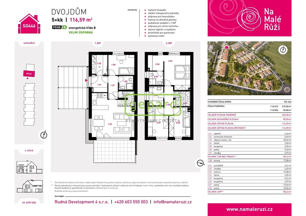 Realitní společnost Gepard nabízí prodej zděného rodinného domu o dispozici 5+kk s terasou a s krytým parkovacím stáním o užitné ploše 117 m2 a pozemkem o ploše 345 m2. Jedná se o součást dostavby 6. fáze projektu "Na Malé Růži" v rozvíjející se lokalitě Drahelčice, Rudná u Prahy. Projekt zahrnuje 40 + 2 domů energetické třídy A a B a je ohraničen ulicemi Na Malé Růži, Jana Nepomuckého a Ke Hřišti.