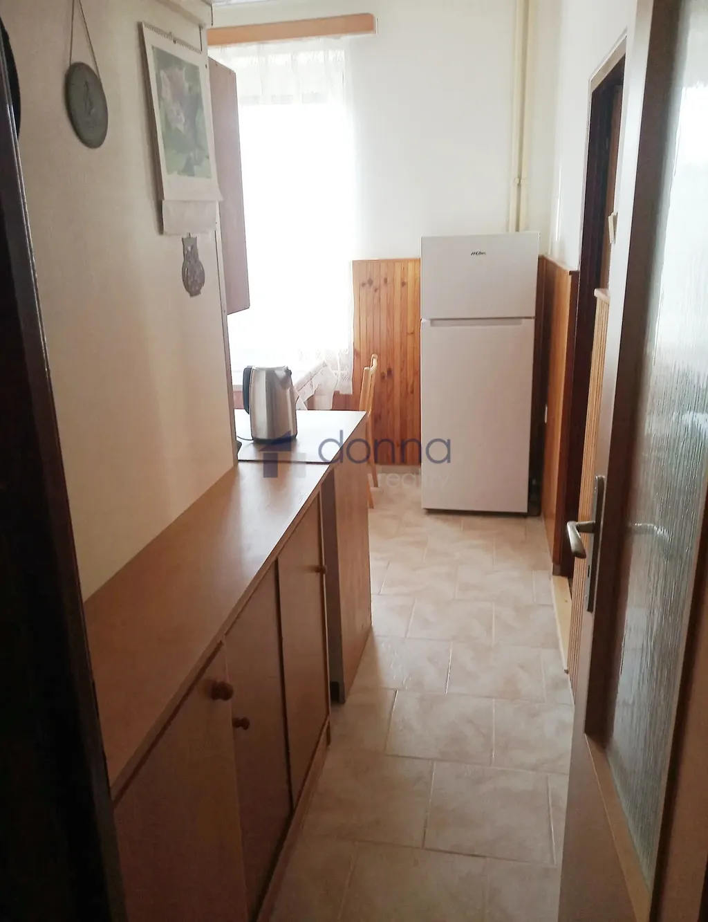 Kuchyň je vybavena linkou, stolem se židlemi, lednicí, pračkou a plynovým sporákem.