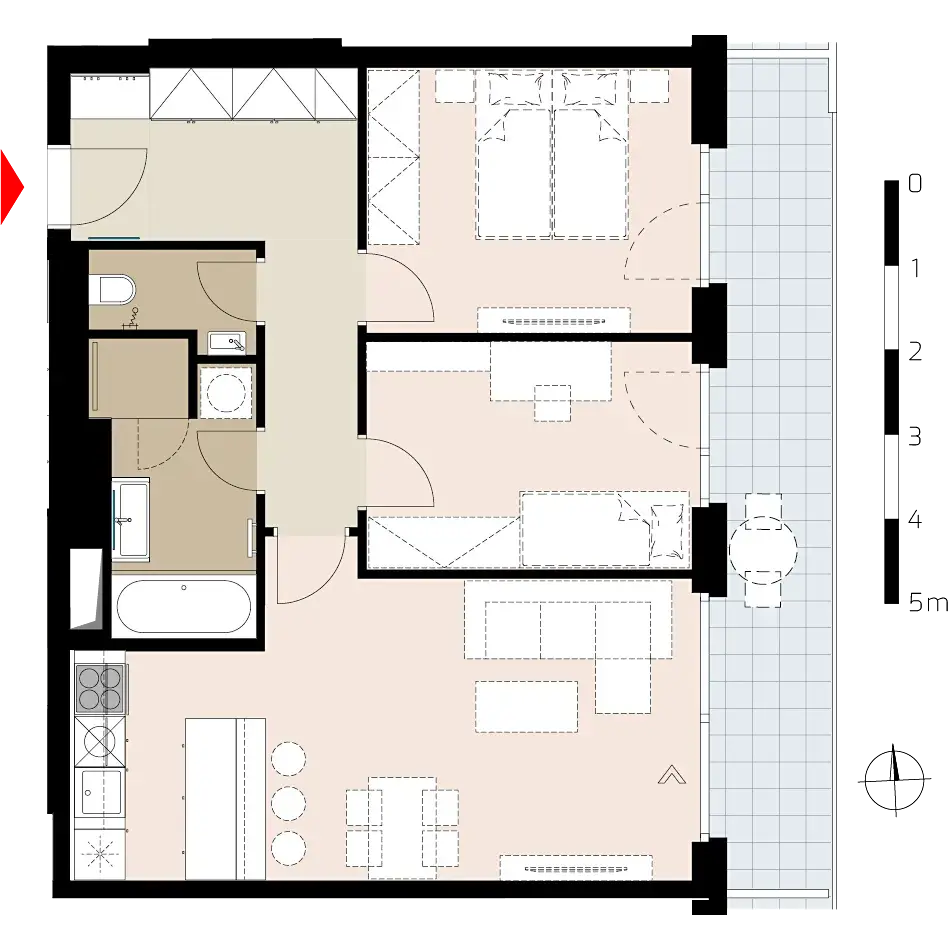 High-quality design and equipment, window blinds, wooden windows with triple-glazed insulation, large-format tiles and floor tiles in the bathrooms, Laufen Pro sanitary ware, bidet showers, oak floors with underfloor heating, above-standard door height of 2.1 m, videophone, chip access to the building.