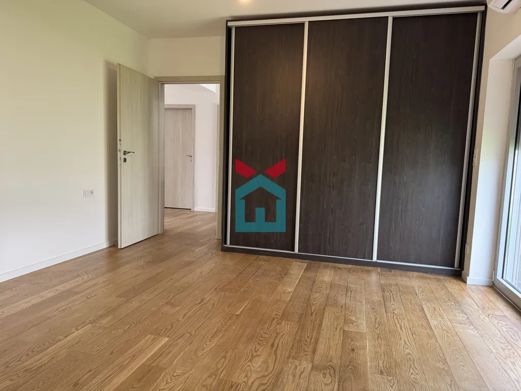 Tato jednotka nabízí komfortní dispoziční řešení s prostornou chodbou, samostatným WC, koupelnou, kuchyní, obývacím pokojem, pokojem, ložnicí se šatnou a samostatnou pracovnou. K jednotce dále náleží komfortní uzavřená zahrada s bazénem o rozloze 119 m²