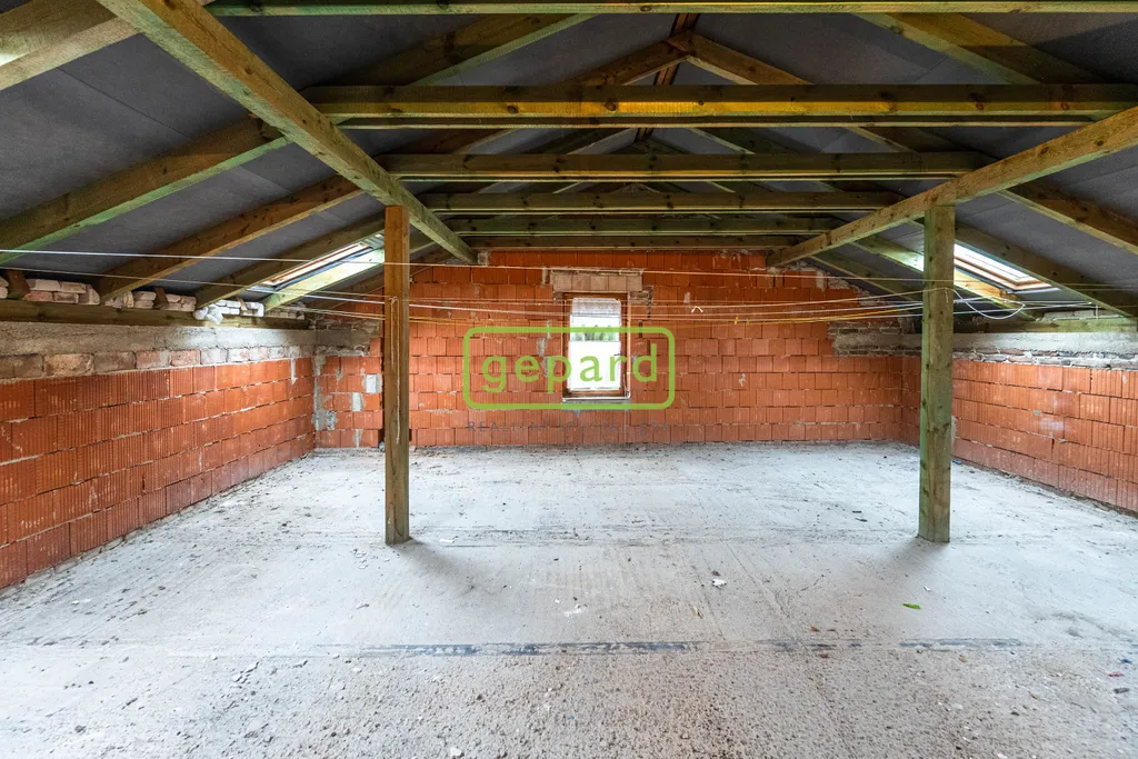 Podkroví – chodba s vchodem na terasu, 2 pokoje, kuchyně, koupelna (sprchový kout, WC a umyvadlo), terasa a nedokončená obytná část o 2 místnostech.