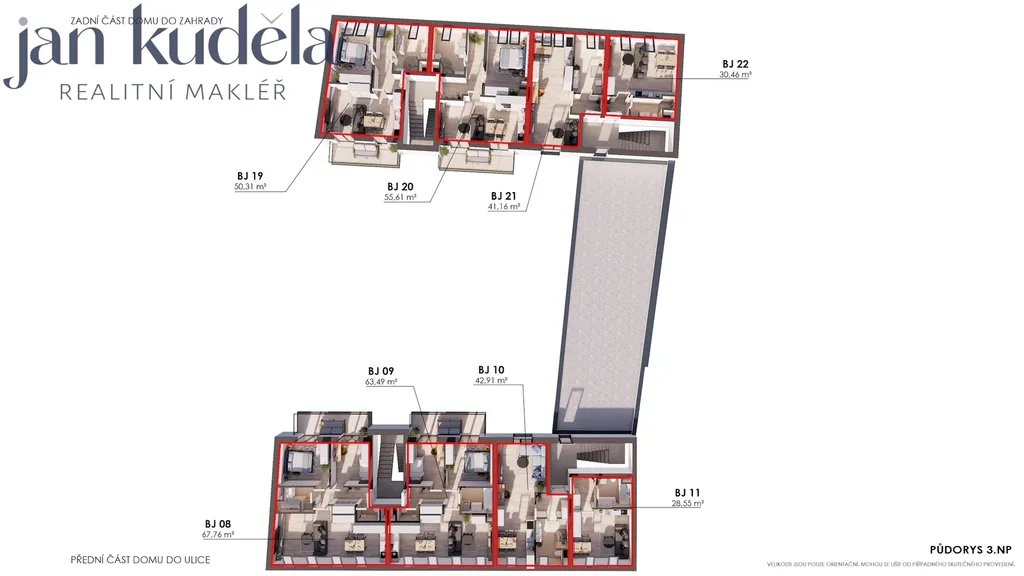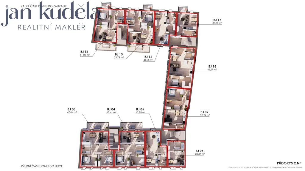 Projekt počítá s výstavbou bytového domu o celkem 22 bytových jednotkách v dispozicích 1+kk, 2+kk a 3+kk. Celková podlahová plocha bytů činí 1 102 m², k dispozici je 22 parkovacích stání ve vnitrobloku a 16 sklepních kójí. Většina bytů disponuje vlastním balkonem nebo předzahrádkou, což výrazně zvyšuje atraktivitu bydlení i jeho dlouhodobou tržní hodnotu.