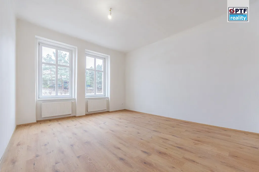 Dispozičně je byt členěn na pokoj s kuchyňským koutem, prostorný neprůchozí pokoj, předsíň, komoru a koupelnu se sprchovým koutem a toaletou.