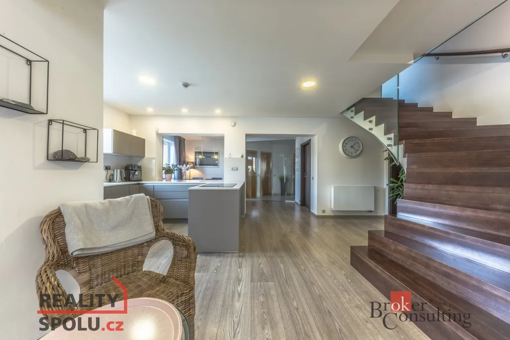 V přízemí se nachází vstupní hala, hlavní obytný prostor zahrnující moderní kuchyni, jídelnu a obývací pokoj s krbovou vložkou, pokoj pro hosty (či pracovnu), technickou místnost, šatnu, prádelnu, koupelnu a WC . V přízemí mohou noví majitelé využívat také útulnou zimní zahradu s kvalitní saunou. V podkroví se nacházejí tři ložnice, šatna, koupelna a WC. Parkování vozidel je zajištěno pod krytým parkovacím stáním a dalším místem pro stání za vraty. Dům je připojen na všechny inženýrské sítě (voda, kanalizace, elektřina, plyn) O efektivní vytápění se stará moderní tepelné čerpadlo v kombinací se solárními panely na střeše, což výrazně snižuje náklady na energie.