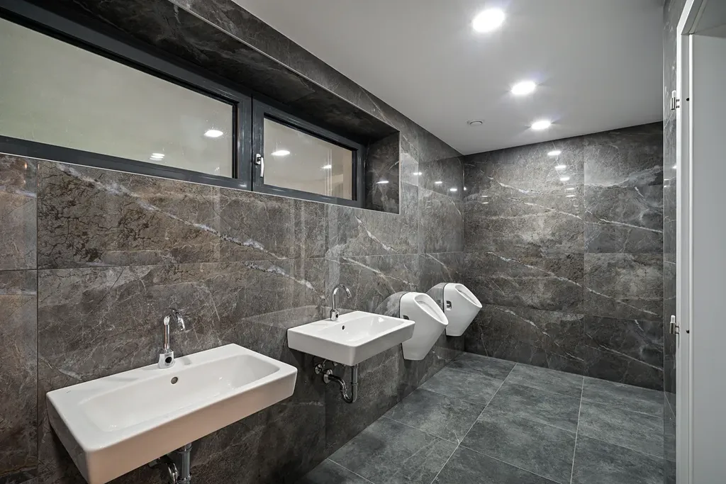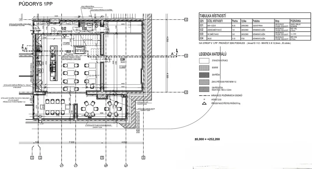Suterén – Přibližně 40 míst k sezení, kancelář, sklad, šatna pro zaměstnance, technické zázemí a sociální zařízení pro personál.