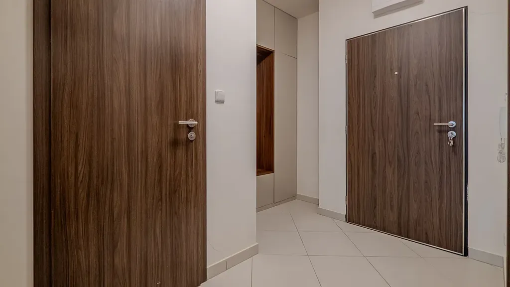 Chodba má dostatek úložných prostor, je zde vstup do komory a další vestavěná skříň na míru.