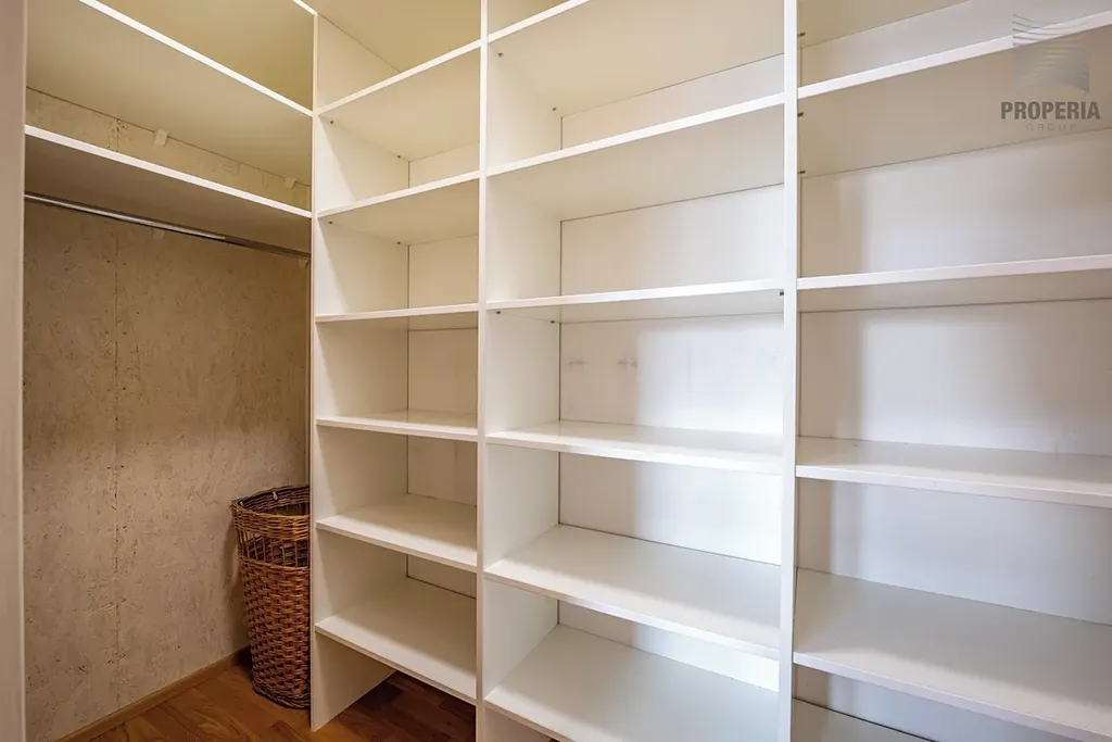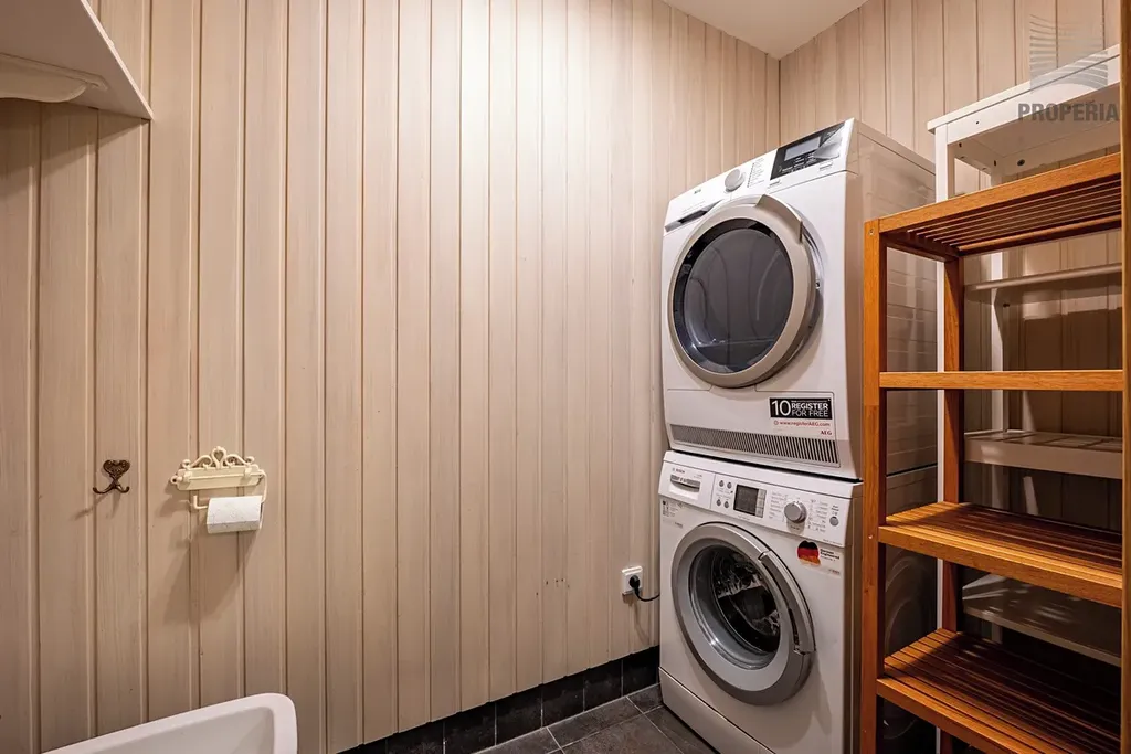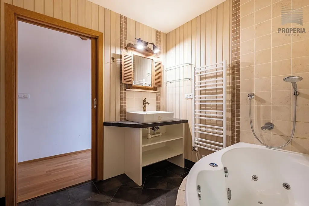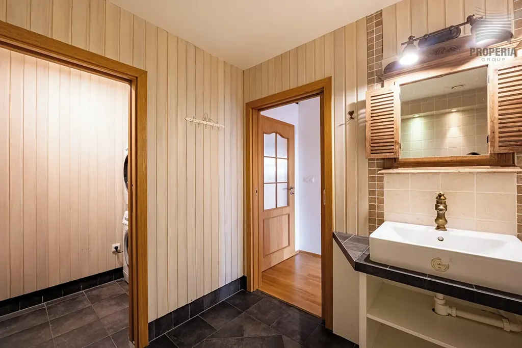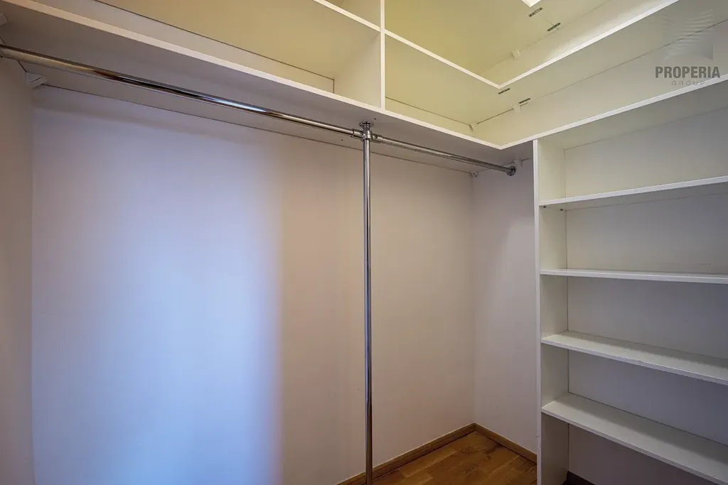 Byt disponuje dvěma koupelnami, velkým množstvím úložných prostor a komfortním zázemím i pro náročnější klientelu. Každá ložnice má vlastní šatnu. Zajímavým architektonickým detailem je částečně skleněná podlaha v patře.