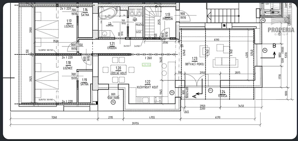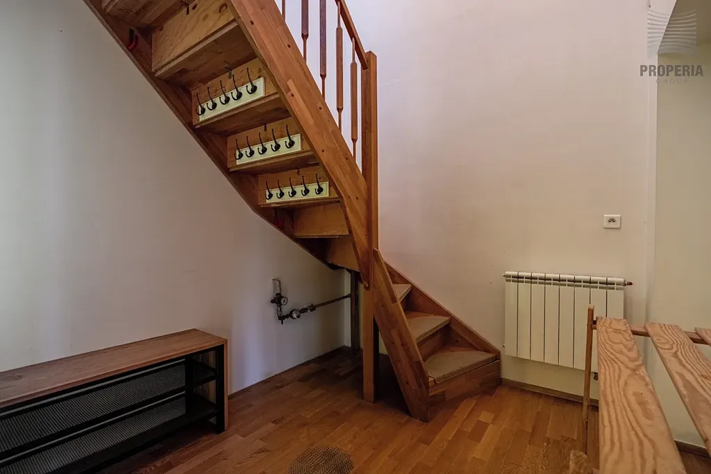 Interiér bytu je rozvržen do dvou podlaží a působí velmi vzdušně a harmonicky. Přirozeně odděluje denní a klidovou část, což zajišťuje dostatek soukromí pro všechny členy domácnosti.