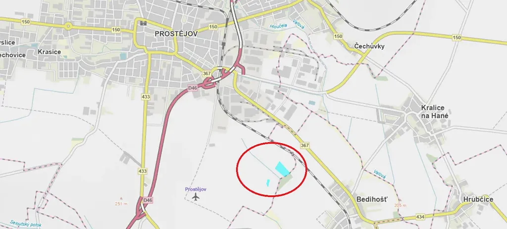 Výměra prodávaných pozemků je 36.814m2. Pozemky se nachází nedaleko za letištěm v Prostějově.