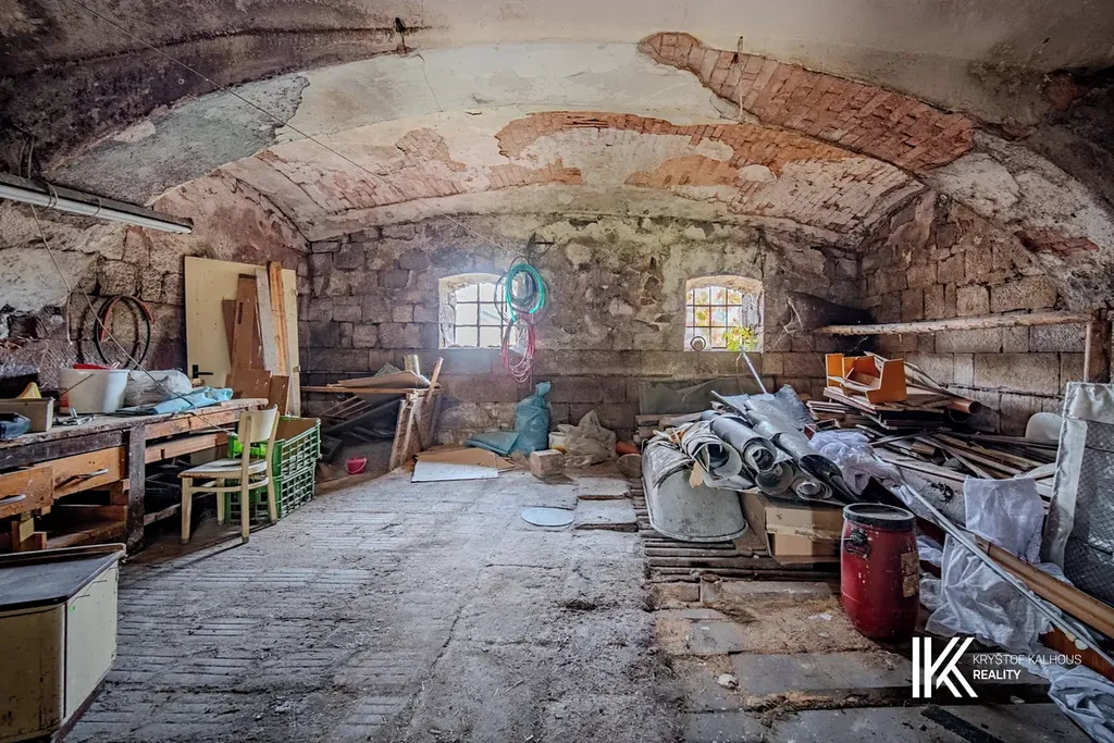 V chodbě se po pravé straně nachází samostatná toaleta a dále v čele chodby stojí koupelna, připravená na kompletní modernizaci. Na vstupní chodbu navazuje vstup do odkloněné části přízemí, začínající chodbou s technickým zázemím, schody do sklepa a schody na půdu. Tato část nabízí obrovský potenciál – z půdy lze vybudovat obytné podkroví s výhledem do krajiny, zatímco sklep může posloužit jako vinárna, sklad potravin či wellness zóna s kamennými klenbami a původními stěnami, které si zachovaly přirozený chlad. Na samotném konci domu pak naleznete poslední velký pokoj, odkloněný lehce stranou. Tento prostor, původně hospodářského charakteru, si přímo říká o přeměnu – může z něj vzniknout ateliér, dílna, nebo další obytná jednotka.