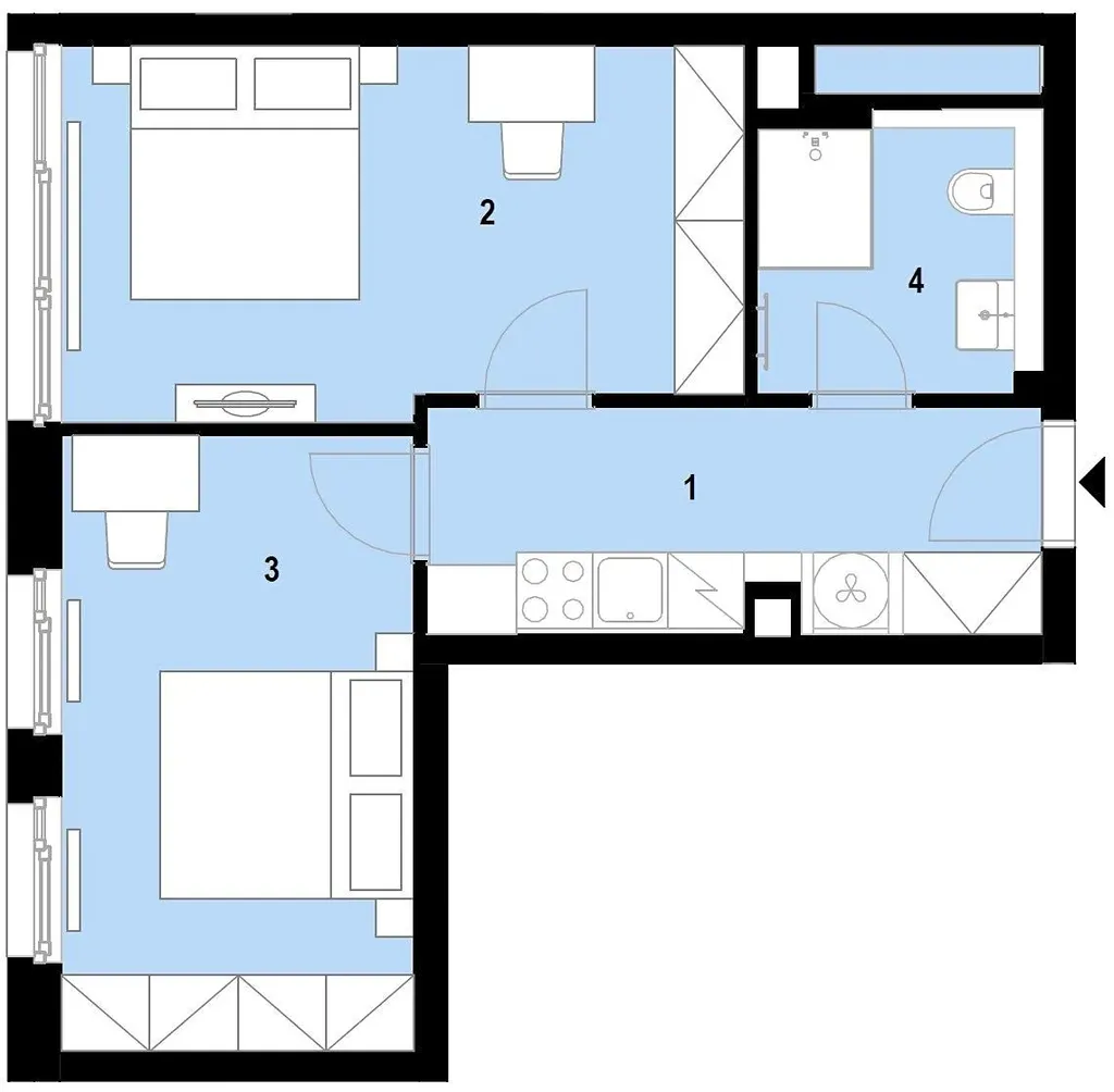Dispozice 2+1 a celková plocha 44 m² v 1. podlaží poskytují promyšleně řešený prostor, který je ideální jak pro investiční účely, tak pro budoucí vlastní bydlení. Jednotka nabízí dva neprůchozí pokoje, kuchyň, elegantní koupelnu se sprchovým koutem a WC.